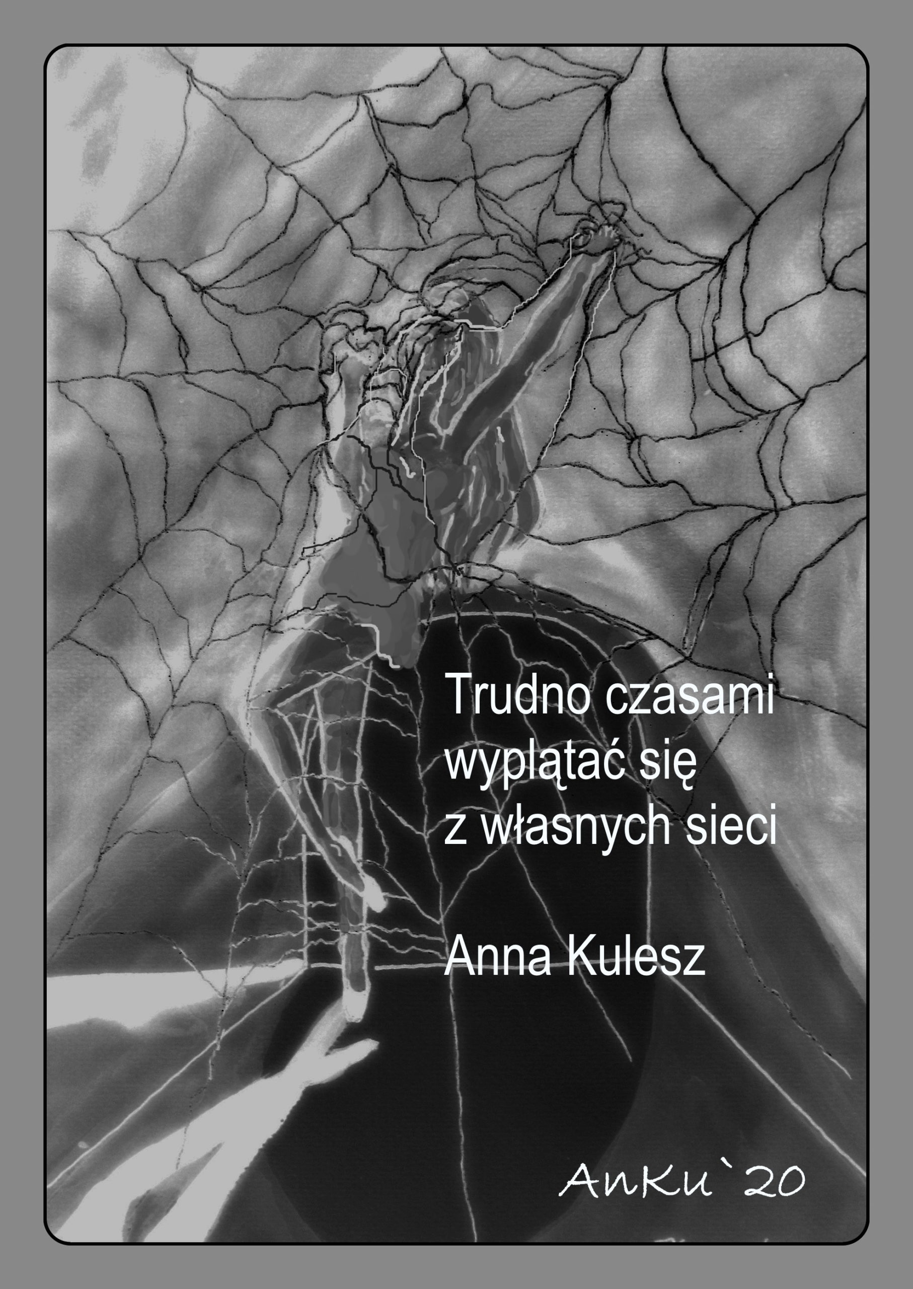 Przypadek z pająkiem natychmiast zaowocował. Siedzę i piszę, a nawet przejrzałam swoje obrazki, czy nie ma między płótnami, kartonami, jakiegoś zbliżonego tematycznie. I jest, chociaż w zasadzie sama pajęczyna… ale musiał jednak wysnuć ją pająk. Jemu służy do łapania owadów, a mnie zainspirowała do czegoś innego…