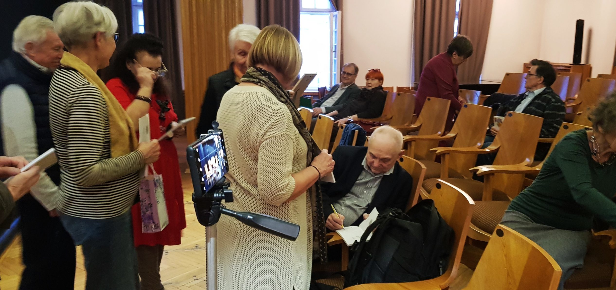 Sala wykładowa pełna; kwiaty, upominki, wzruszenia, uściski, rozmowy przed, i po spotkaniu.